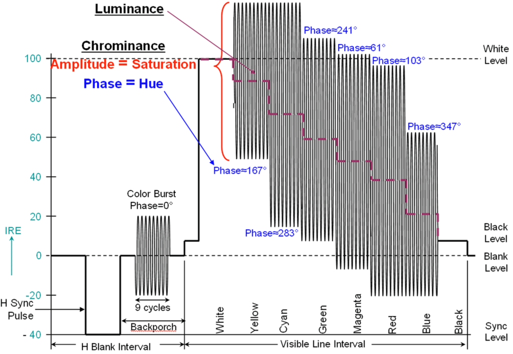 실제 색상 정보는 이 기준에 대해 위상(Phase)과 진폭을 변조한 색 부반송파 형태로 전송된다.